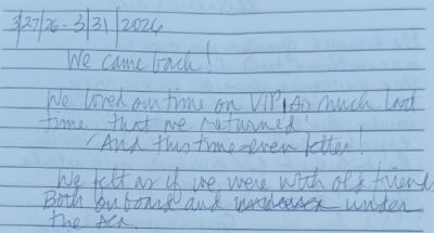 Bien que j’aie déjà donné mes impressions à Mélody cet après-midi concernant notre séjour sur le VIP ONE je voulais également te confirmer que tout s’est parfaitement bien passé.